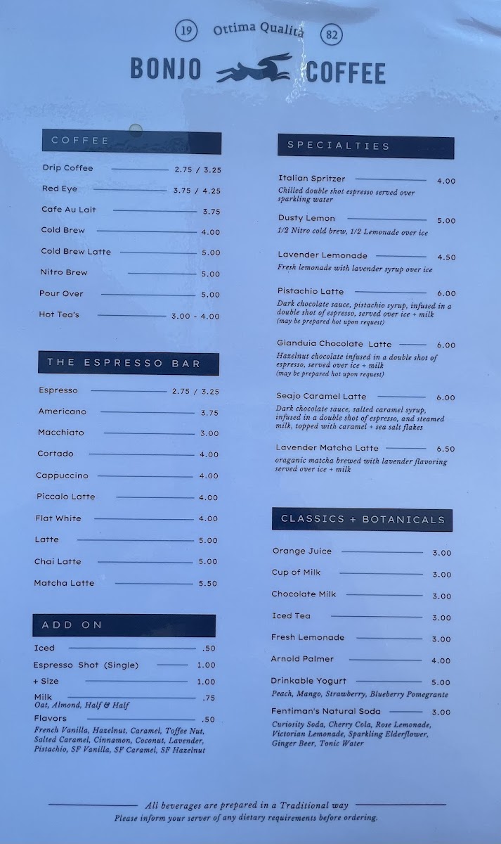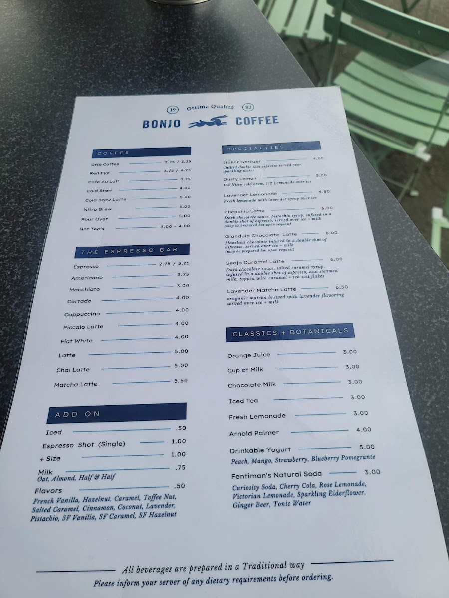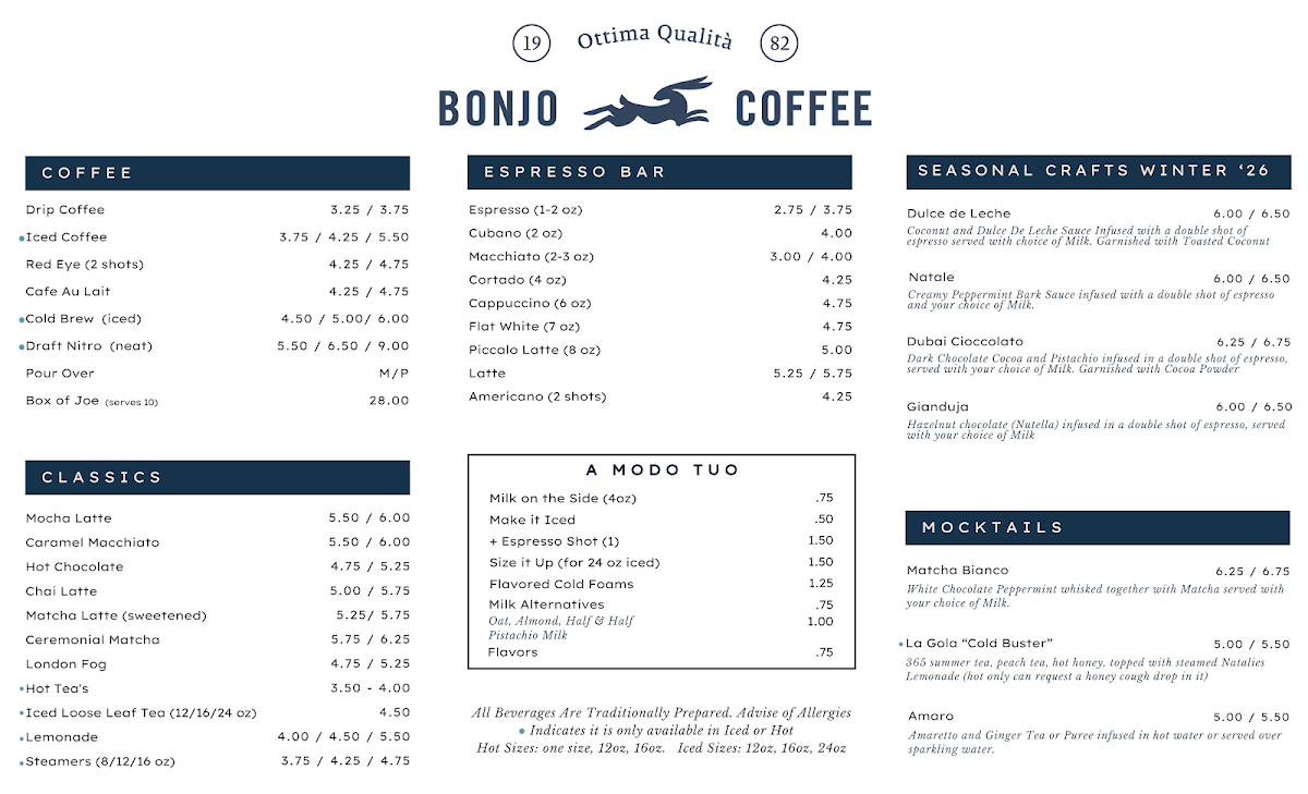 At BonJo Coffee Roasters, the menu focuses on classic espresso bar staples executed with careful roast‑to‑cup precision, making it a favorite local stop for true coffee lovers. Reviewers note that the coffee list centers on beloved beverages like Espresso ($2.75+), Cubano ($4.00+), Macchiato ($3.00+), Cortado ($4.25+), and Cappuccino ($4.75+), showcasing a range from quick shots to richer, milk‑based options that satisfy different tastes and moods (delivery menu). Additionally, longtime patrons fondly mention traditional Italian‑inspired drinks such as Americano, Flat White, and Latte that reflect the café’s roots in old‑world espresso culture and its commitment to authentic preparation (menu history). This concise yet thoughtfully curated selection underscores the shop’s strength: expertly roasted beans presented in timeless formats that appeal to both espresso purists and casual sippers alike.